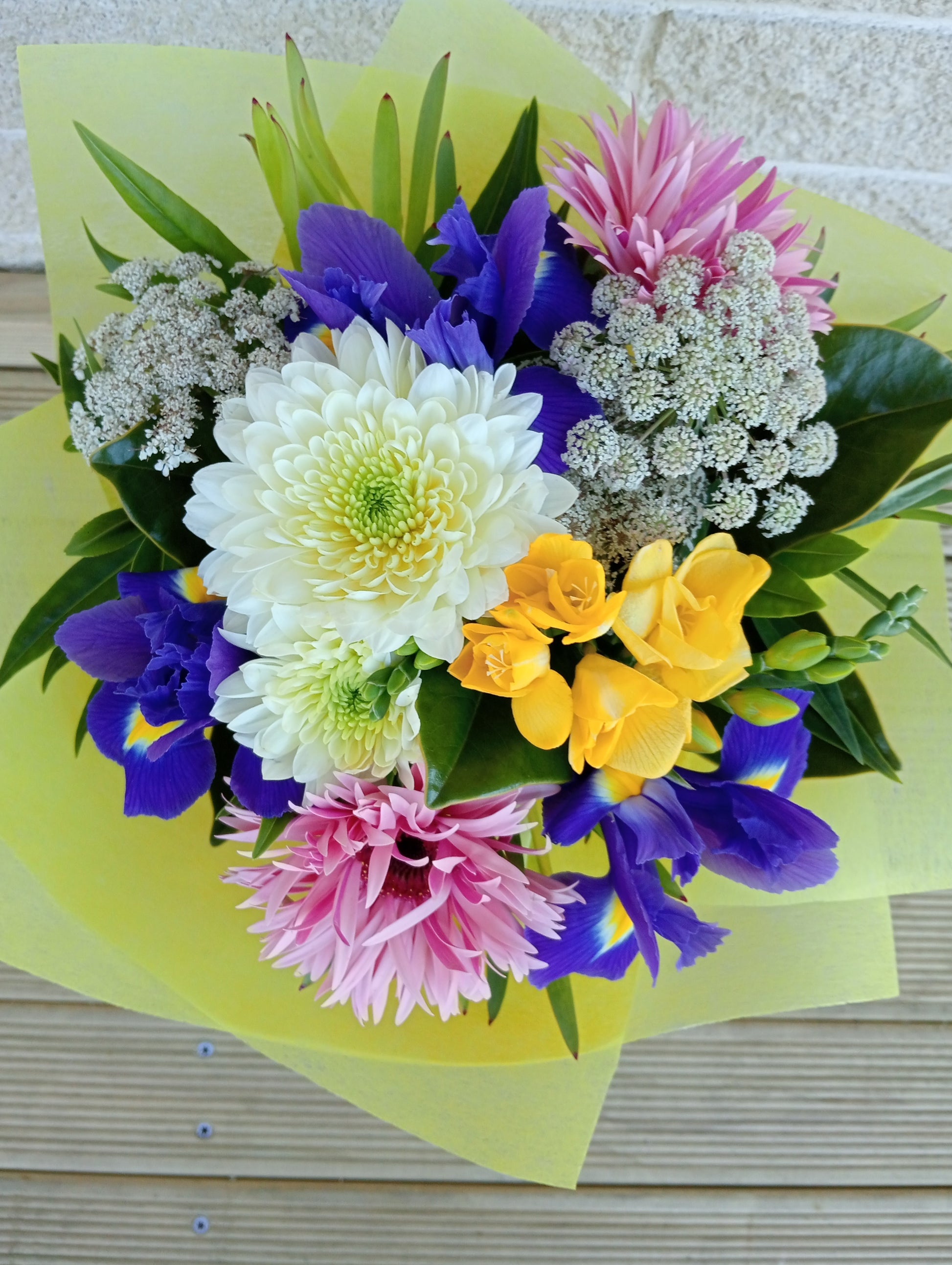 The “Vibrant Spring Medley” bouquet features a delightful blend of flowers. It includes large white chrysanthemums and pink gerberas, bright yellow freesias, deep blue irises, and clusters of delicate Queen Anne’s lace. The arrangement is accented with broad green leaves and wrapped in cheerful yellow paper. Its fresh and lively appearance captures the essence of spring.
